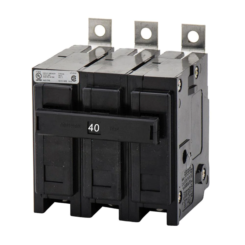 Cutler-Hammer three phase three pole 40 ampere bolt-on molded case circuit breaker with maximum voltage rating of 240V at 60Hz high interrupting rating of 10 kiloampere at 240V functions long-time and instantaneous.