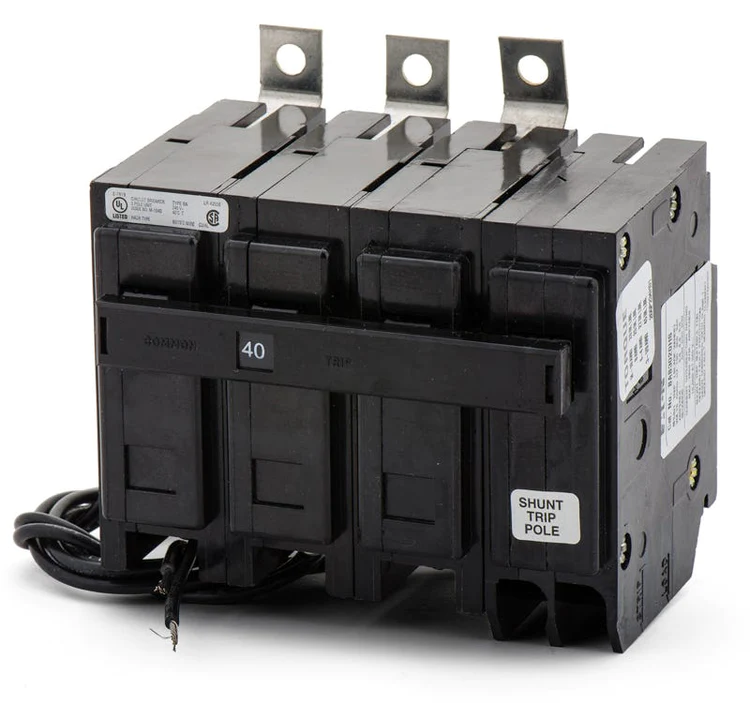 Eaton / Cutler-Hammer Shunt Trip Breaker Its Compact And Easy to Install three poles thermal-magnetic circuit breaker has a current rating of 40 amps at 40 deg c and voltage rating of 240 Vac it has an interrupt current rating of 10 kilo-amps it accommodates aluminum/copper wire of size 14 to 4 AWG at load it has extended tang line terminal and box lug load terminal for convenient connection it has bolt-on type connection it is suitable for industrial applications circuit breaker is Ul 489 listed and Csa certified.