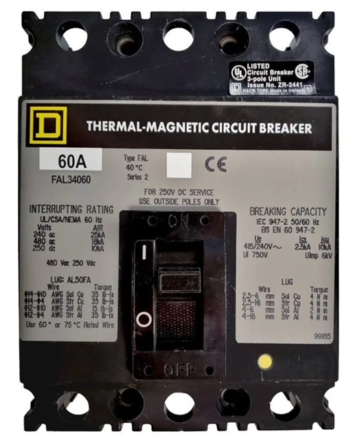 Schneider Electric / Square D Circuit Breaker Its Compact And Easy to Install Fal series three poles molded case circuit breaker provides overload and short circuit protection it has a current rating of 60 amps at 40 deg c and voltage rating of 415 Vac/250 Vdc it has an interrupt current rating of 25 kilo-Amps at 240 Vac 18 kilo-Amps at 480/480 Star/277 Vac and it includes load and terminal line lug circuit breaker is Ul listed and Csa certified.