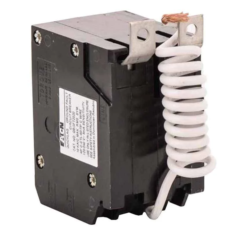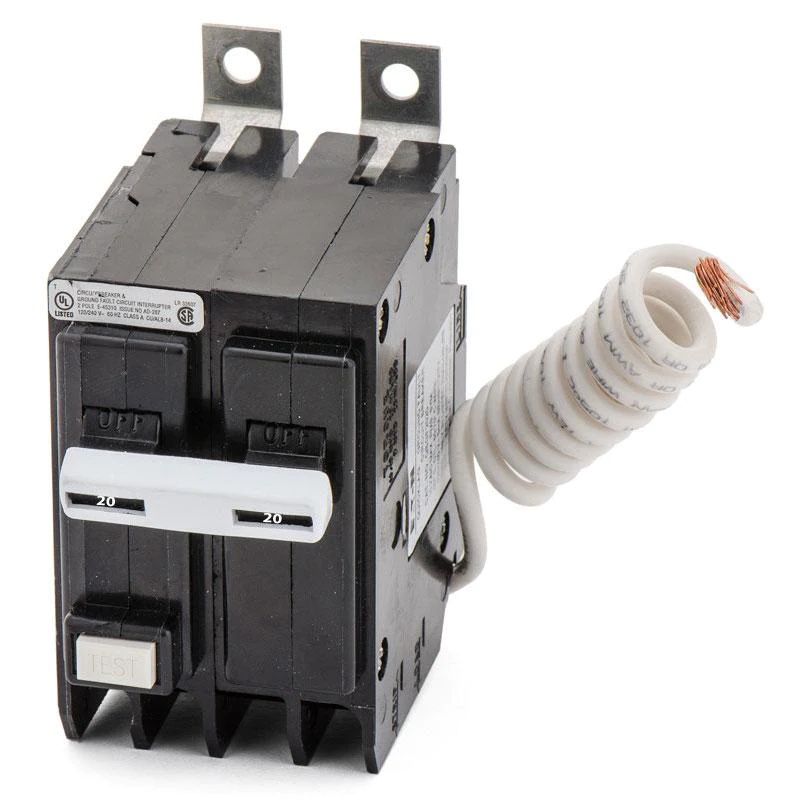 Eaton QBGF series double pole 20 ampere bolt-on molded case circuit breaker with maximum voltage rating of 240V tripping method thermal magnetic and standard interrupting rating of 10 kiloampere at 120V complete with self-test ground fault protection (LI) Long-Time and Instantaneous trip functions & load side lug terminals.