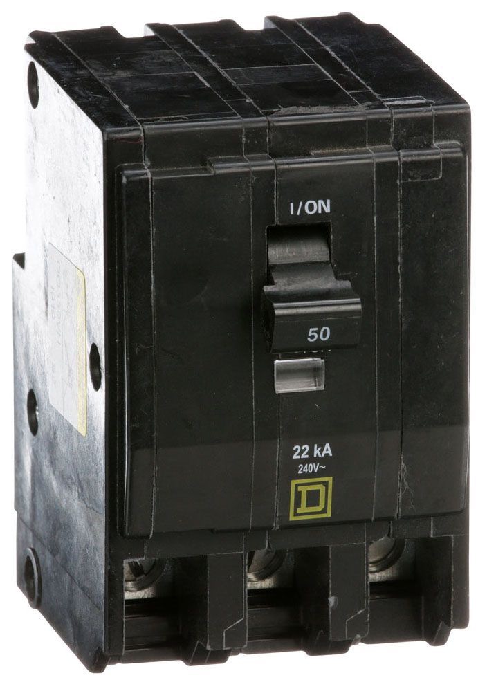 Square D QO series three pole 50 ampere plug-in molded case circuit breaker with maximum voltage rating of 240V tripping method thermal magnetic and standard interrupting rating of 22 kiloampere at 240V complete with (LI) long time and instantaneous trip functions suitable for QO series series load centers.